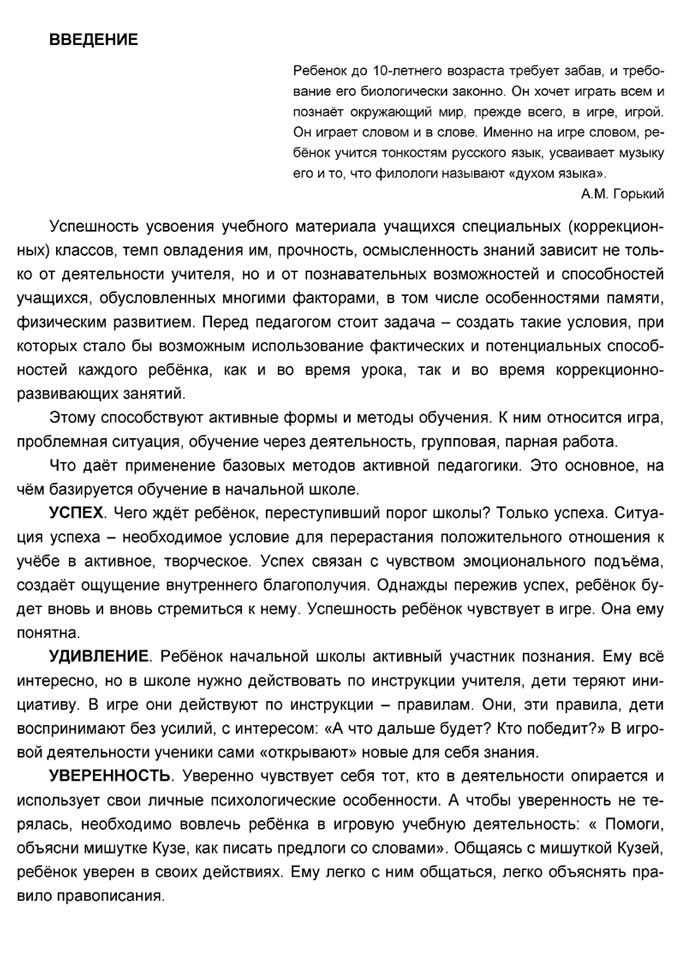 Аннотация Введение Глава I. Копилка развивающих методик для детей 1.1 Игры–физминутки 1.2 Логопедическая гимнастика 1.3 Релаксация 1.4 Дидактические игры и задания для развития мыслительных операций Глава II. Игры для коррекции письменной речи 2.1 Работа с твердыми и мягкими согласными 2.2 Правописание звонких и глухих согласных 2.3 Однокоренные слова и безударные гласные Глава III. Дидактическая игра по теме «Предлоги и приставки» Глава IV. Примерные конспекты фронтальных занятий в классах VII вида Заключение Список литературы