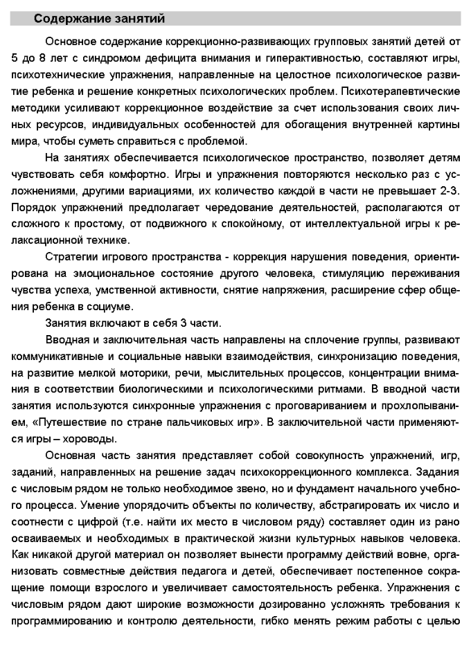 Рабочая программа «Коррекционно-развивающие занятия по развитию функций контроля и программирования для детей с синдромом дефицита внимания и гиперактивностью»