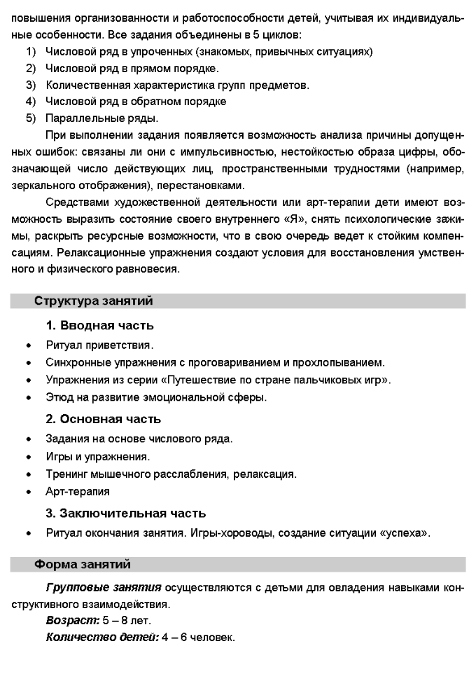 Аннотация Пояснительная записка Практическая часть Занятие 1 ... Занятие 11 ... Занятие 21 ... Литература Приложения Синхронные упражнения с проговариванием и прохлопыванием Комплекс упражнения «Путешествие по стране пальчиковых игр» Этюды Задания на основе числового ряда Психотехнические игры и упражнения Дыхательные упражнения Тренинг мышечного расслабления, релаксация Арт-терапия Игры–хороводы
