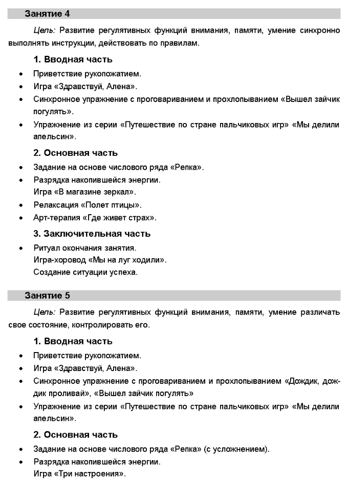Аннотация Пояснительная записка Практическая часть Занятие 1 ... Занятие 11 ... Занятие 21 ... Литература Приложения Синхронные упражнения с проговариванием и прохлопыванием Комплекс упражнения «Путешествие по стране пальчиковых игр» Этюды Задания на основе числового ряда Психотехнические игры и упражнения Дыхательные упражнения Тренинг мышечного расслабления, релаксация Арт-терапия Игры–хороводы