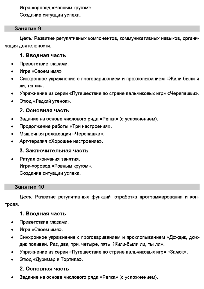 Аннотация Пояснительная записка Практическая часть Занятие 1 ... Занятие 11 ... Занятие 21 ... Литература Приложения Синхронные упражнения с проговариванием и прохлопыванием Комплекс упражнения «Путешествие по стране пальчиковых игр» Этюды Задания на основе числового ряда Психотехнические игры и упражнения Дыхательные упражнения Тренинг мышечного расслабления, релаксация Арт-терапия Игры–хороводы