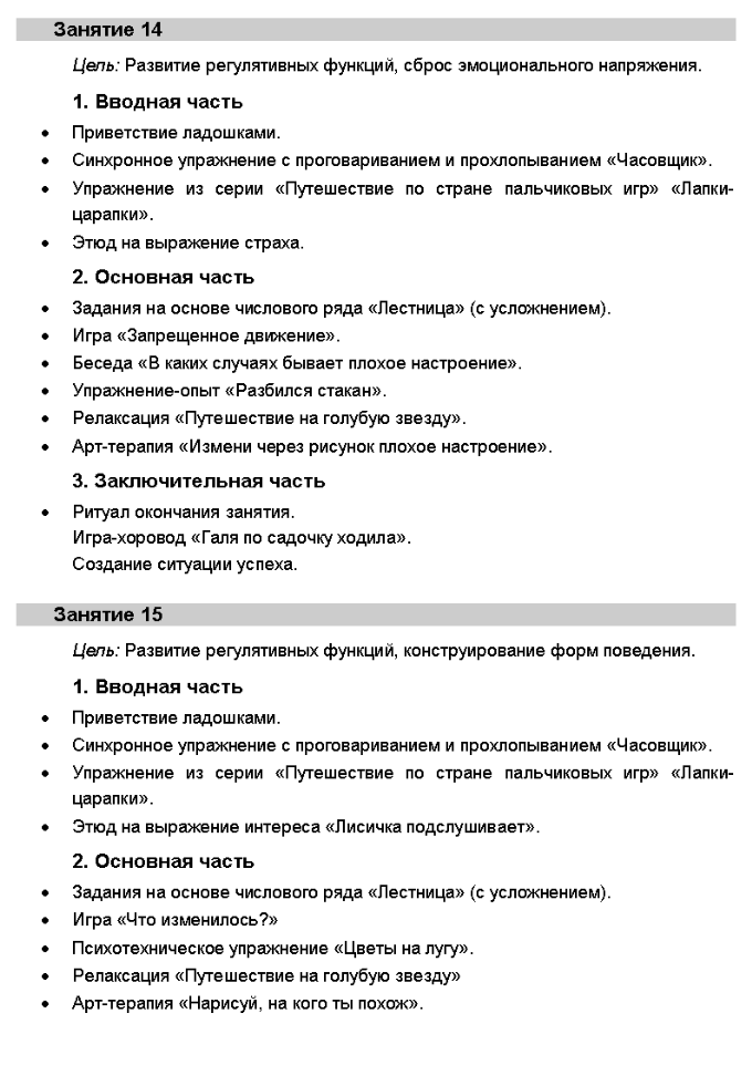 Аннотация Пояснительная записка Практическая часть Занятие 1 ... Занятие 11 ... Занятие 21 ... Литература Приложения Синхронные упражнения с проговариванием и прохлопыванием Комплекс упражнения «Путешествие по стране пальчиковых игр» Этюды Задания на основе числового ряда Психотехнические игры и упражнения Дыхательные упражнения Тренинг мышечного расслабления, релаксация Арт-терапия Игры–хороводы