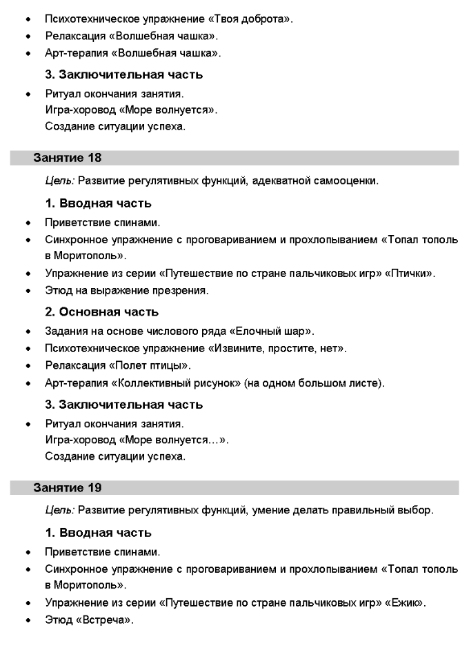 Аннотация Пояснительная записка Практическая часть Занятие 1 ... Занятие 11 ... Занятие 21 ... Литература Приложения Синхронные упражнения с проговариванием и прохлопыванием Комплекс упражнения «Путешествие по стране пальчиковых игр» Этюды Задания на основе числового ряда Психотехнические игры и упражнения Дыхательные упражнения Тренинг мышечного расслабления, релаксация Арт-терапия Игры–хороводы