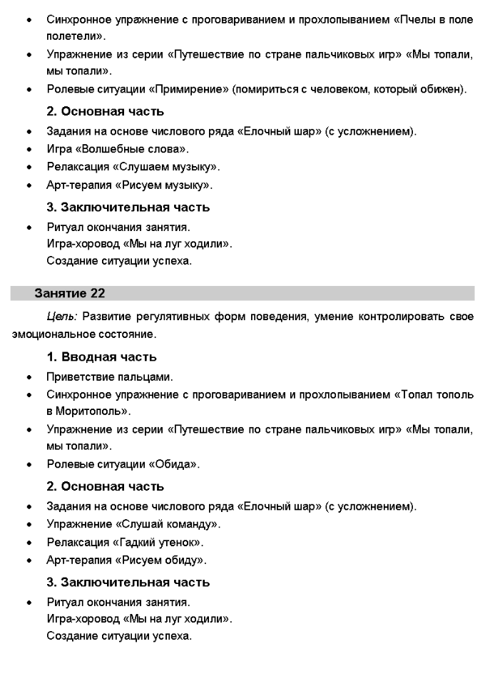 Аннотация Пояснительная записка Практическая часть Занятие 1 ... Занятие 11 ... Занятие 21 ... Литература Приложения Синхронные упражнения с проговариванием и прохлопыванием Комплекс упражнения «Путешествие по стране пальчиковых игр» Этюды Задания на основе числового ряда Психотехнические игры и упражнения Дыхательные упражнения Тренинг мышечного расслабления, релаксация Арт-терапия Игры–хороводы