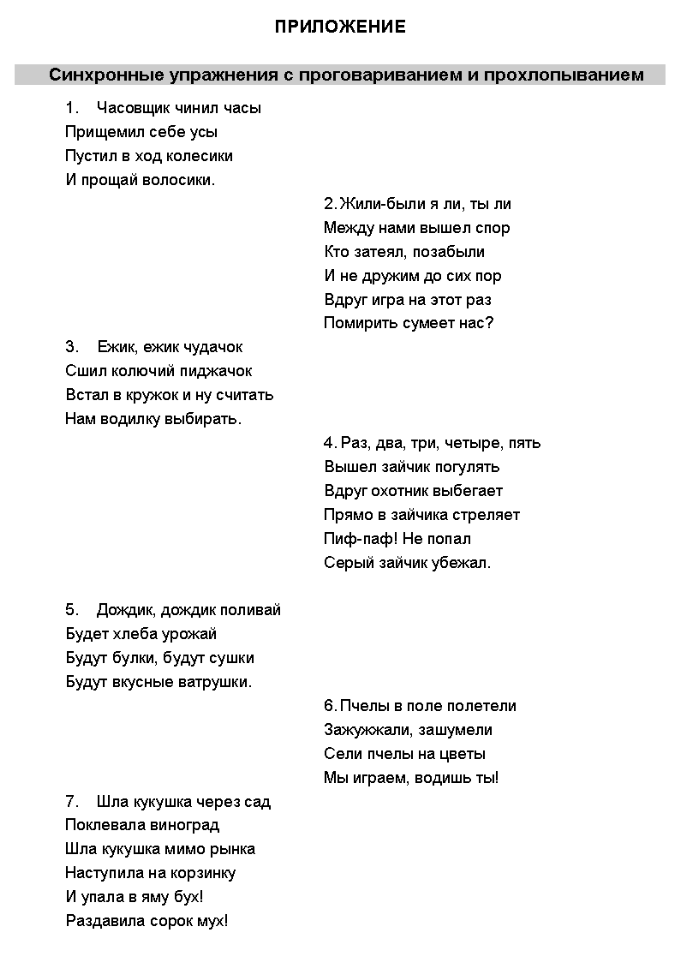 Аннотация Пояснительная записка Практическая часть Занятие 1 ... Занятие 11 ... Занятие 21 ... Литература Приложения Синхронные упражнения с проговариванием и прохлопыванием Комплекс упражнения «Путешествие по стране пальчиковых игр» Этюды Задания на основе числового ряда Психотехнические игры и упражнения Дыхательные упражнения Тренинг мышечного расслабления, релаксация Арт-терапия Игры–хороводы